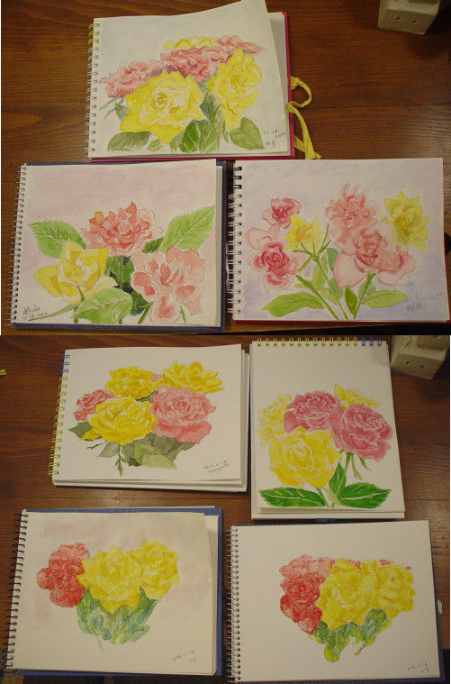 ・花をかたまりとしてスケッチブックに配置し、後から濃いところに色を筆入れします。