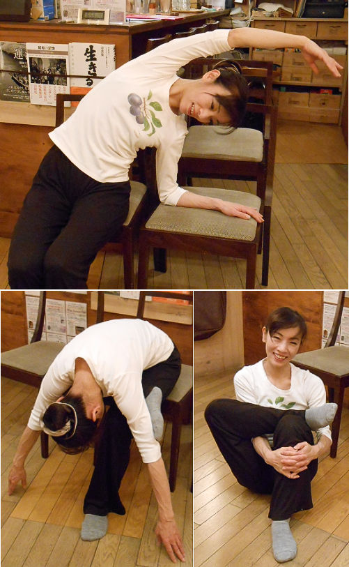 (上)脇を伸ばすストレッチです。背筋をまっすぐにして行います。